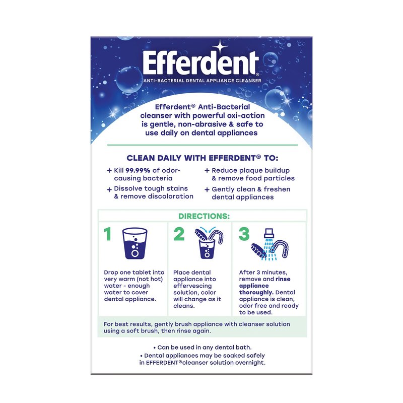 - Use Efferdent retainer cleaner tablets daily to clean retainers, full-plate dentures, partials, aligners and other dental appliances