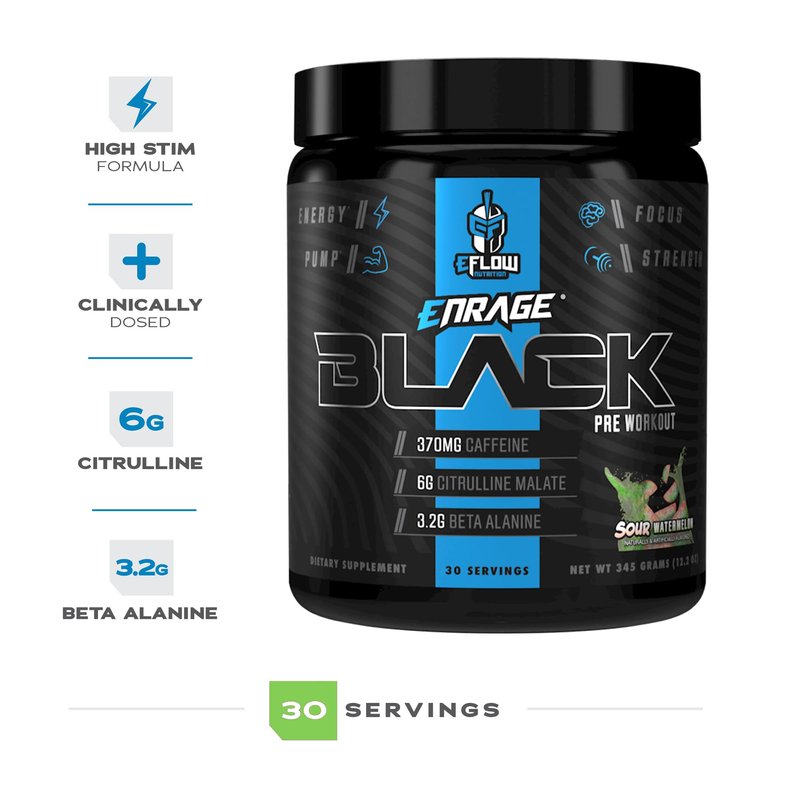 eFlow Nutrition Enrage Black High Stimulant Pre Workout Supplement - Preworkout Powder to Boost Energy, Pumps and Strength - 4 Flavors (30 Servings) (Sour Watermelon)