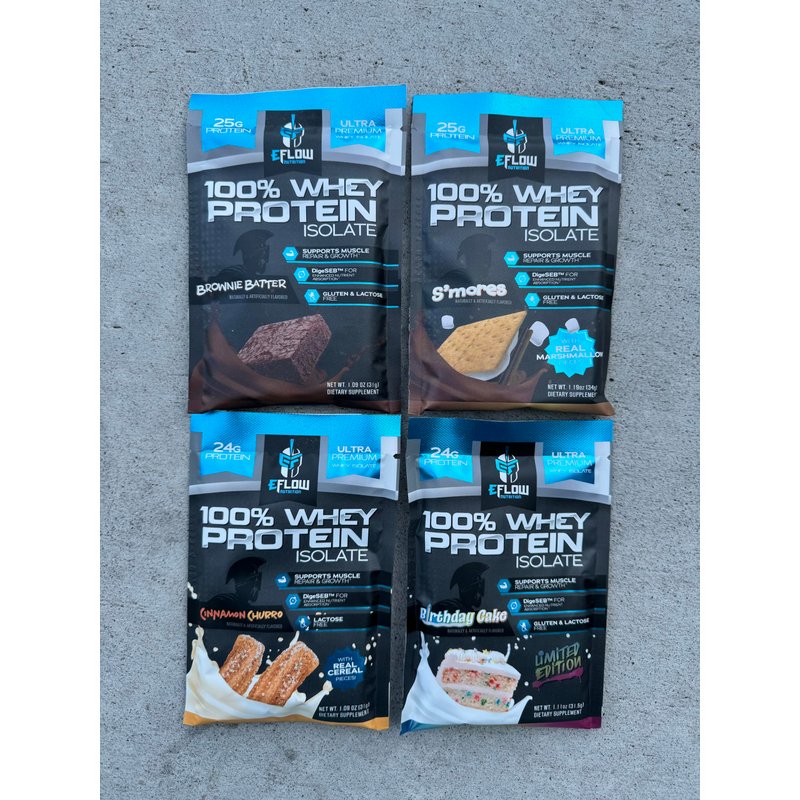 eFlow Nutrition Whey Protein Sample Variety - Isolate Protein Powder Samples, Low Calorie, Fast-digesting, Premium Quality, Travel Packs, Low Carb (4 Pack)