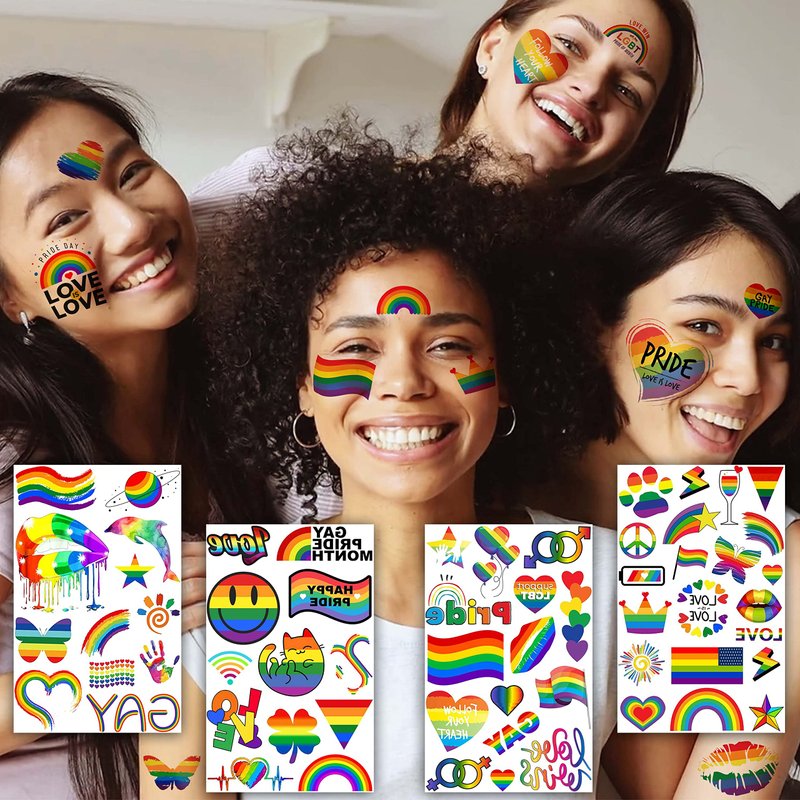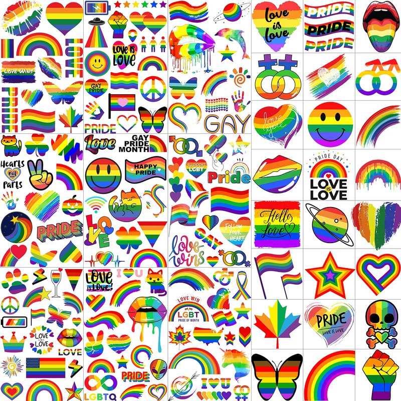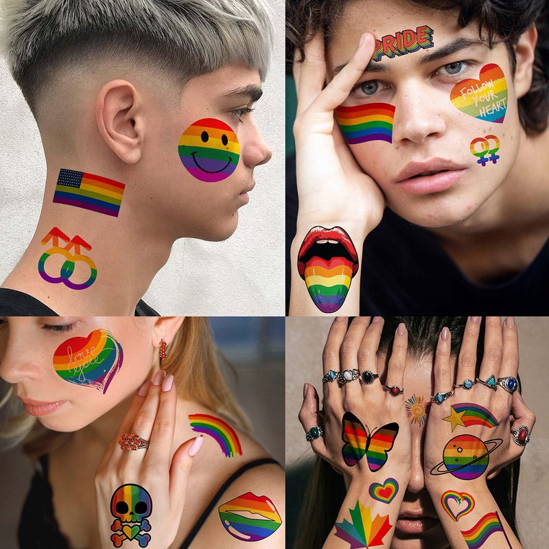 - 🍷11 Sheets 132+ PCS Gay Pride Temporary Tattoos Sticker Fashion Designs🍸 EGMBGM Brand Original 3D Multicolor Lips Smile Face Wifi Love Heart Flash Stripes Maple Victory Star Butterfly Colorful Rainbow Temporary Tattoos. There Are 2 Large Sheets 7.8"x5.9" Rainbow Face Stickers For Adults and 9 Small Sheets 4.7"x2.9" Pride Tattoos Temporary Rainbow Accessories For Women In Each Package.