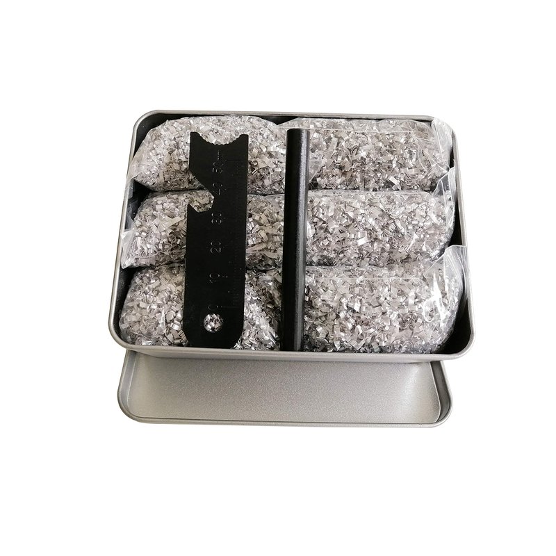 - 6 resealable zip closure bags ( 3 1/6 in long x 2 1/2 in wide) in 2 of free tin container, each bag is packed full of shiny new shaved, shreds, chips, spiral, powder 99.99% pure magnesium without oxidation.