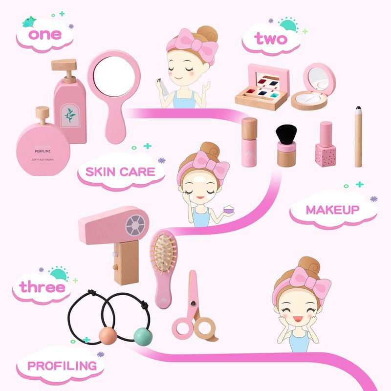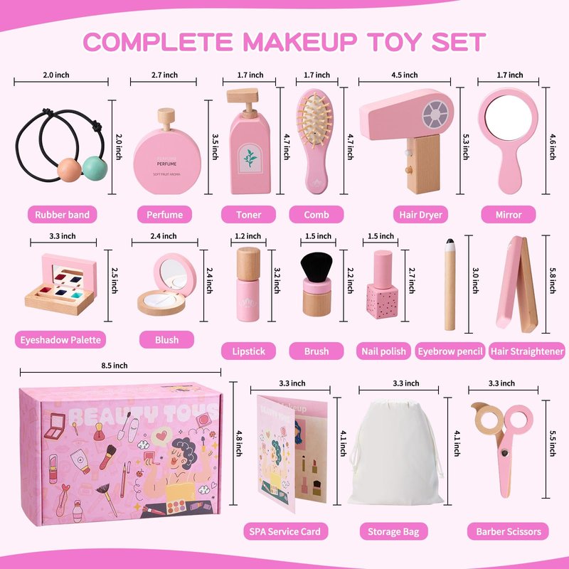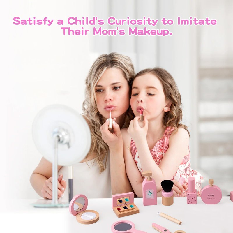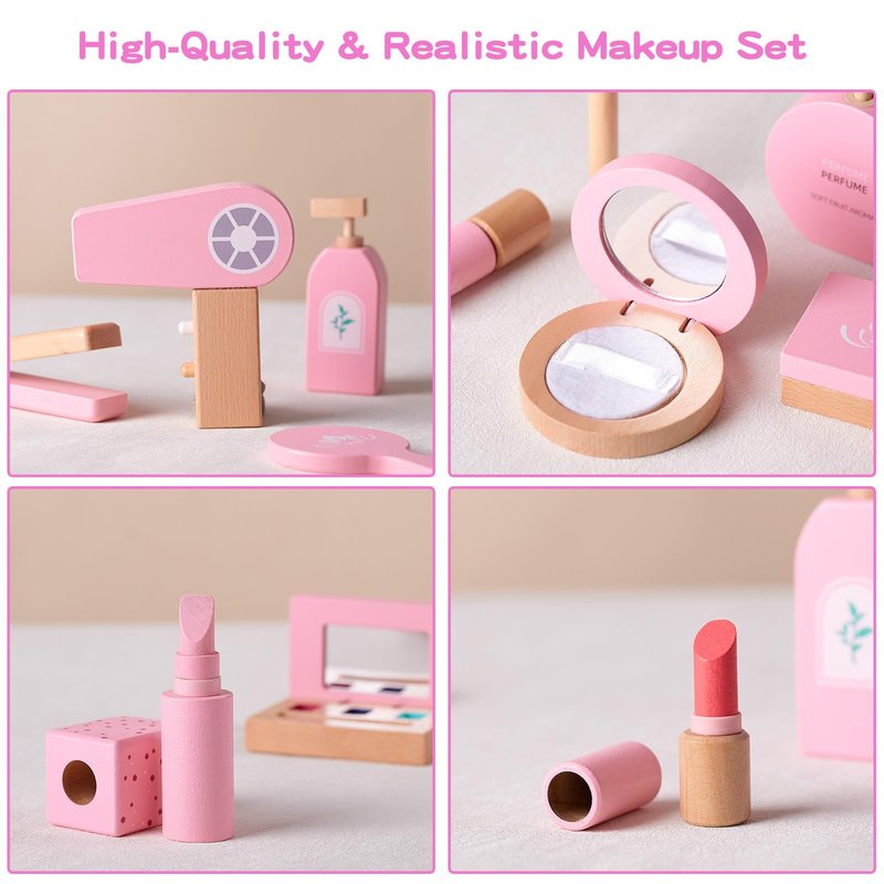 - 【NON-TOXIC & SAFETY】: The wooden makeup toy is CPC and ASTM certified in the USA. Premium quality materials makes this toy beauty set long-lasting and durable, Each piece is made from 100% real wood, each piece is painted with non-toxic paint and made from renewable resources, Smooth and soft edge is safe for your child to play with.