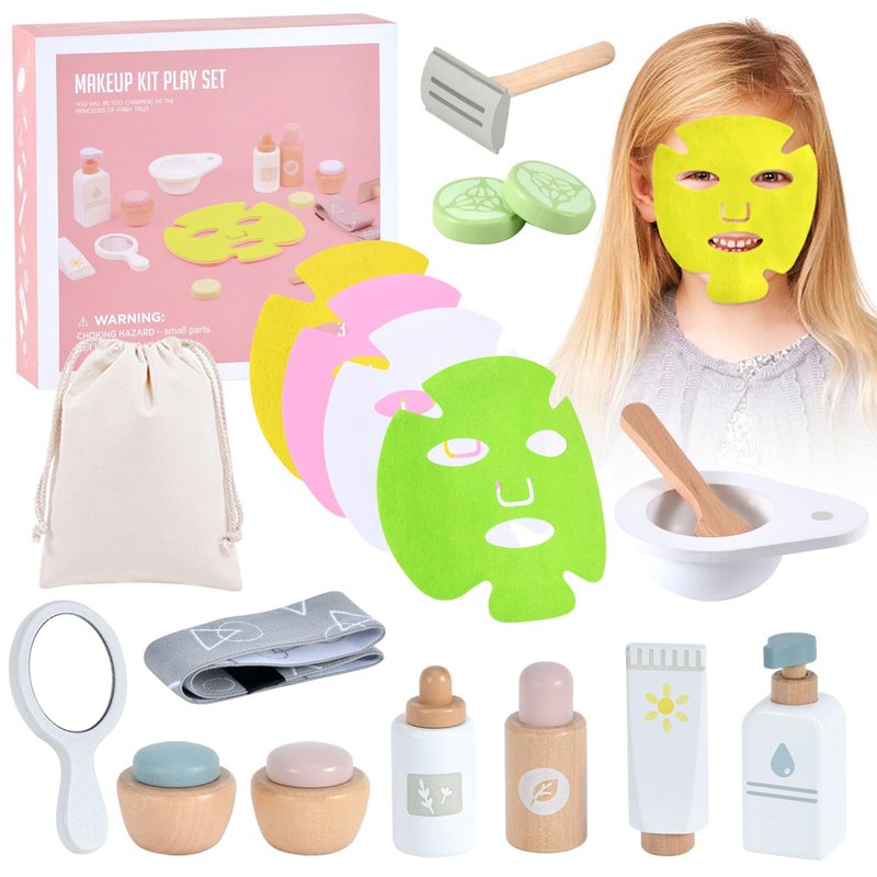 - 18PCS Wooden Toys Makeup Kit : The wooden beauty salon play set with storage bag will come to you with a mirror, razor, 2* eye masks, 2* face creams, sunscreen, facial cleanser, facial toner, essence, face mask mixing bowl, mask stick, hair band, 4* masks.