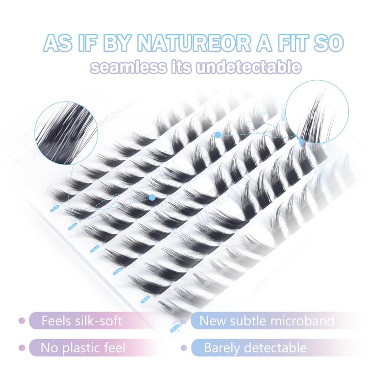 Discover perfect eyelashes with EHSZM BEAUTY's high-quality lightweight lash clusters. Thanks to the addition of a brand-new softening factor, these lash clusters have an unprecedentedly soft touch. The thin band design is more comfortable. They are natural and lightweight, and when paired with high-quality professional glue, they are suitable for all-day wear. Made of new materials, they offer high cost performance without sacrificing durability or comfort. Highly favored by beauty lovers and professional beauticians.