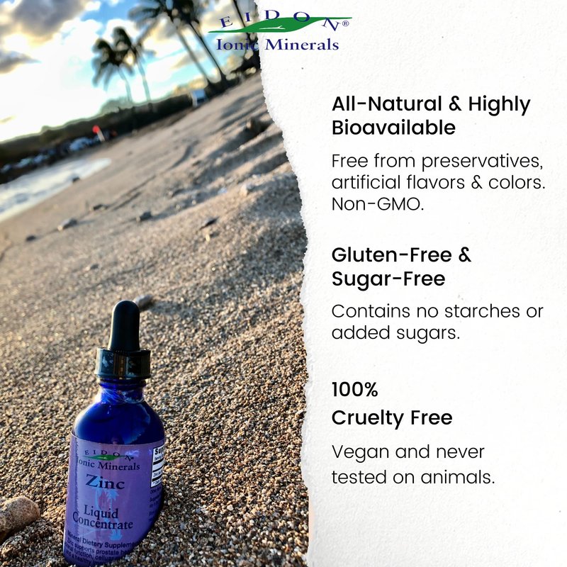 Zinc is an essential mineral that has proven integral to multiple body system functions, including the cardiovascular, digestive, metabolic, musculoskelatal and immune system. Zinc can enhance the sense of taste and smell, and is rapidly depleted by stress. Take the guesswork out of supplements: Eidon uses a proprietary process that transforms pure mineral crystals into a fully hydrated, 100% bioavailable liquid ionic supplement. The Eidon difference: Large doses are used in solid supplements because most of the mineral is not absorbed. Eidon minerals are 100% bioavailable. It is not necessary to take large doses in order to be effective.