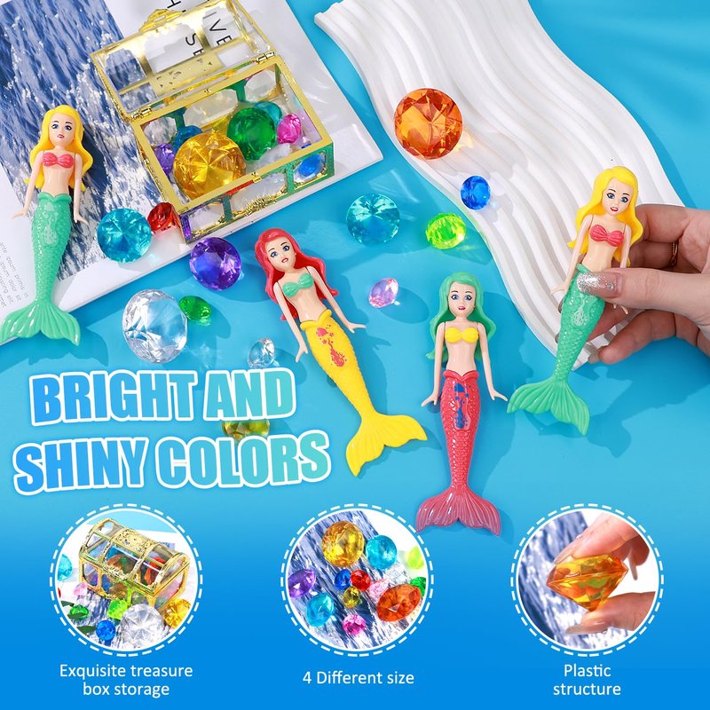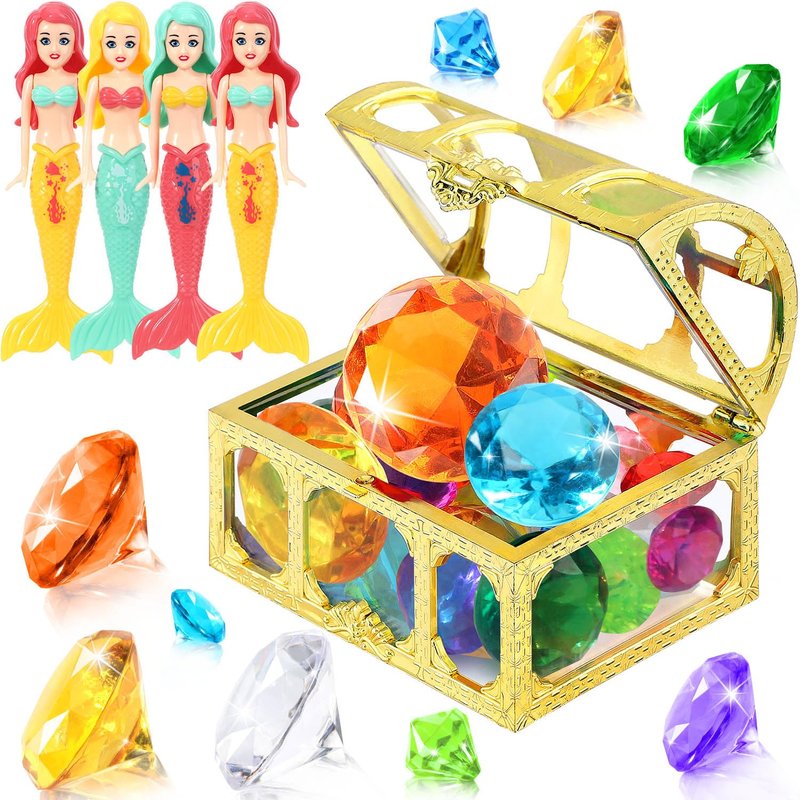 - Package Including: The kids pool toys feature with 21 pack assorted colors and a various of size diamond gems. And 4pcs toys measure with 1.65" x 1" x 5.35" , all swim toys packed in a plastic vintage pirate treasure box