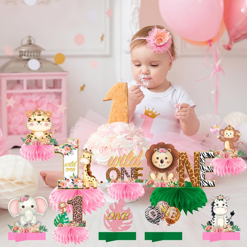 - [Safari Jungle 1st Birthday] - This pink safari jungle animal theme first birthday honeycomb centerpieces decorations integrates various cute animal elements and palm leaves into the 1st birthday party event. These fun pattern designs will make your jungle one year old birthday party more warm and happy.