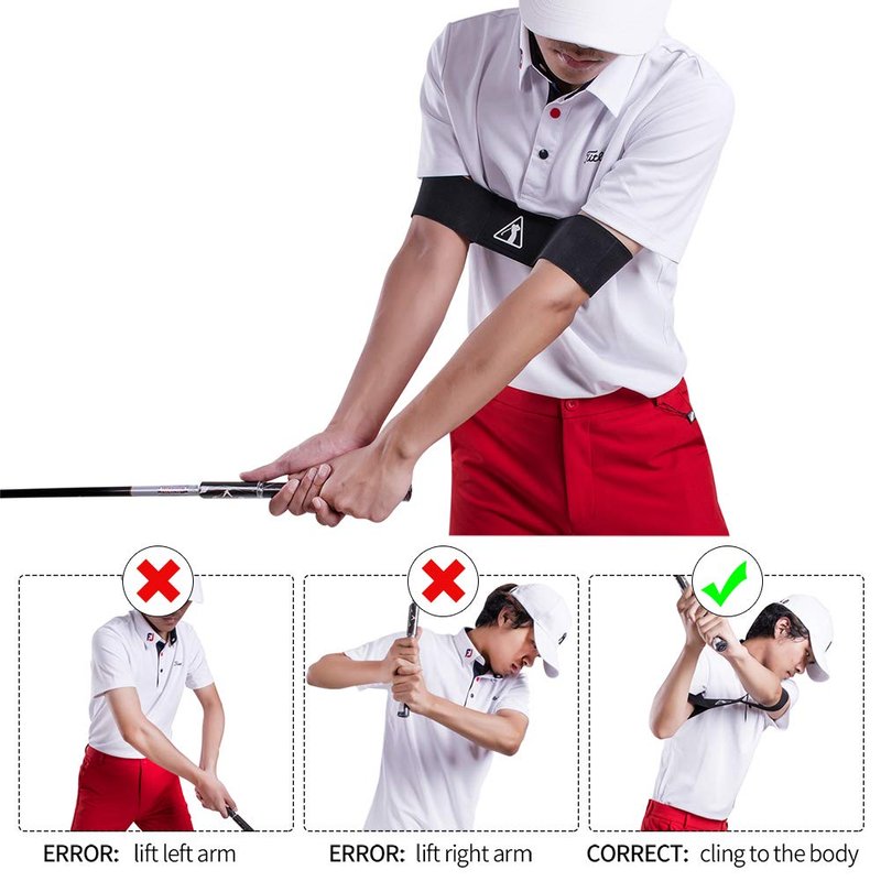 - [STABILIZING ARM AID] The correct gesture for swing is that the right upper arm's inside should be close to right armpit, while right elbow shapes an inverse triangle with the unbend left arm. The beginner would lift the right arm instead of clinging to the body, resulting in "flying elbow". This aid can restraint the right arm, helping arm maintain a correct posture and forming muscle memory. The the arm drives the club with the shoulder drives the arm.The aid is elastic fabric, stretchable.
