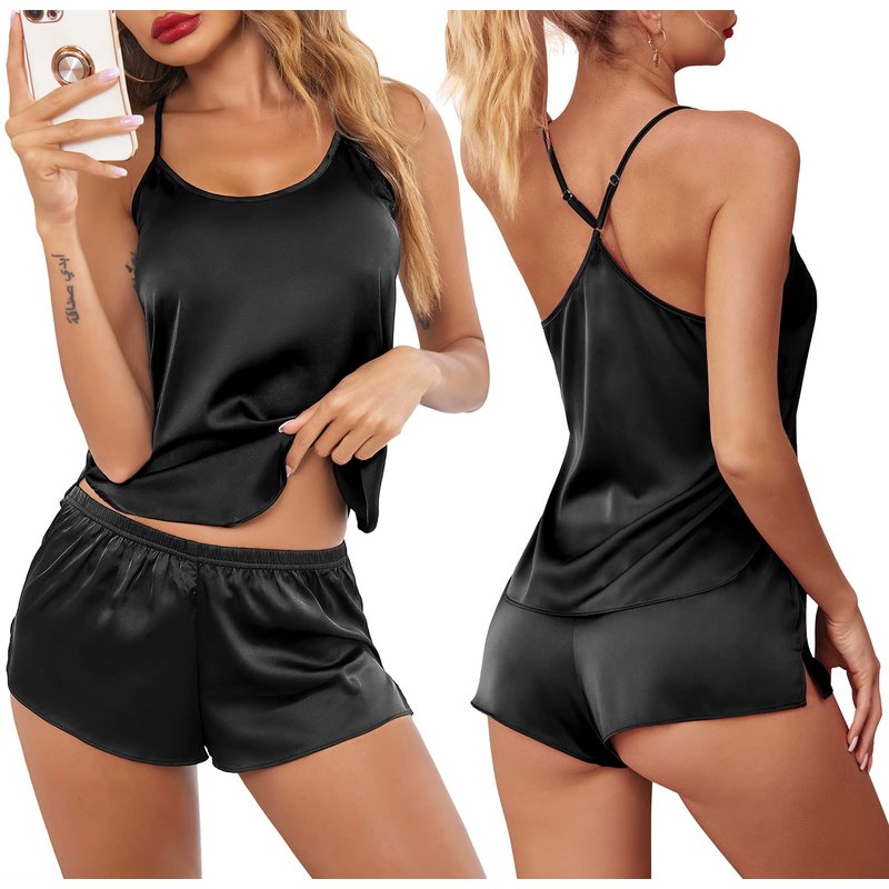 - The satin pajamas for women features o neck camisole top with adjustable spaghetti straps. This sleeveless top and shorts set give u a pretty and cute look.