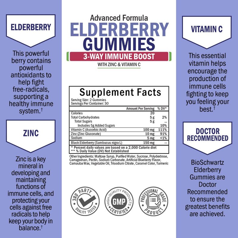 Elderberry gummies with vitamin c for immune support from BioSchwartz are premium immunity vitamins offering immune defense for women, men, kids, teens, children, adults, and seniors. Our sambucus elderberry gummies aremade with Black Elderberry sambucus nigra and naturally rich in antioxidants and multiminerals with zinc are built upon the base of a powerful antioxidant found in elderberries (specifically black elderberry), making them the perfect elderberry vitamins to provide your immune system maximum immunity support for health and wellness in every season. Unlike other immunity vitamins and elderberry supplements for adults, our advanced elderberry with zinc and vitamin c for adults immune support gummies formulated by professionals offer an immune boost similar to that of other immune support (like elderberry sambucus pills, elderberry capsule, elderberry capsules organic, elderberry capsules 1000mg, elderberry capsules with zinc, or zinc and elderberry supplements) but in the form of truly delicious, natural, vegan elderberry gummies with vitamin c and zinc. So what do you get from an immune support supplement immune system booster that you actually look forward to taking every day? A superior immunity boost, that’s what! Don’t let another season pass without trying our premium, ultra-pure immunity booster gummies…because nothing staves off the sniffles like a quality immune booster!