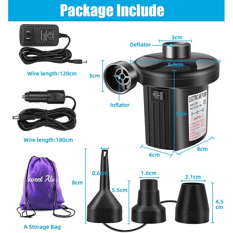 - 【3 DIFFERENT NOZZLES】The air mattress pump with 3 sizes of nozzles can fit most inflatable,such as air mattress, sofa, inflatable rafts, airbeds, boat, pool toys, swimming rings etc. (Do not for balloons, basketball, tires.)