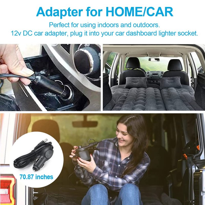- ✅Adapter for HOME & CAR: The inflatable air mattress pump supports two powers adapter: a 12V DC car power adapter & an 100-240V AC home power adapter. Perfect for using indoors and outdoors, useful for travel, camping, festival and outdoor activities.