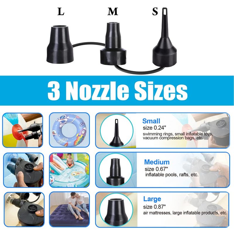 - ✅3 Different Universal Nozzles: The electric air mattress pump is equipped with 3 different sizes of nozzles – S (0.24''), M (0.67''), L (0.87''), allowing you to inflate/deflate many tools: air mattress, air sofa, air boat, airbed, swimming ring, inflatable kayak, inflatable pool, pool toy, pool float, inflatable raft, small bounce house, inflatable furniture, vacuum storage bag, inflatable sleeping bag, etc (Not for balloons, basketball, tires).