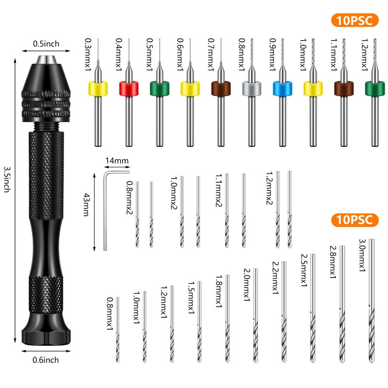 - Package details: you will receive 1 piece electric hand drill, 8 pieces drill bits, 1 piece pin vise hand drill, 10 pieces mini drills, 10 pieces PCB twist drills and 1 piece screwdriver, drill bits have 4 different sizes, approx. 0.8-1.2 mm, mini drills have 10 different sizes, are approx. 0.8-3.0 mm, and twist drills are approx. 0.3-1.2 mm