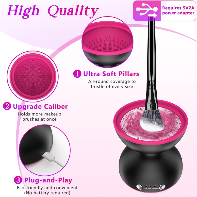 - 【High Quality Makeup Brush Cleaner Machine】Our electric makeup brush cleaner machine is made of high quality materials and scientific structure, soft rubber protects the bristles from damaging the structure, suitable for all-round cleaning, with suction cups at the bottom to maintain the stability of the cleaning process, and all-round cleaning to get a better makeup effect.
