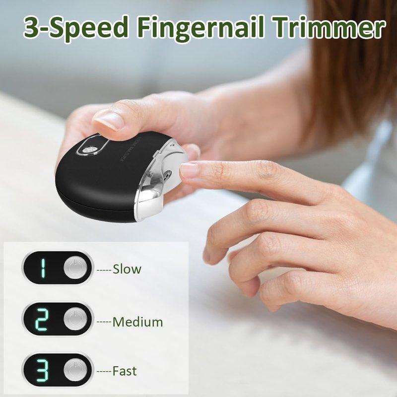 This electric nail clipper makes trimming nails easy and precise. With two adjustable speeds, it can gently remove nails or swiftly trim hangnails. An integrated LED light illuminates the nail area so you can see exactly where to cut. The nail file smoothly shapes nails to perfection. A convenient fingernail scrap storage compartment keeps work areas clean. Recharge via USB so you're never without power. Its ergonomic design and lightweight feel make it comfortable for any hand. Whether trimming nails at home or on the go, this nail clipper's automatic cutting and dual speeds make the task simple and safe for all ages.