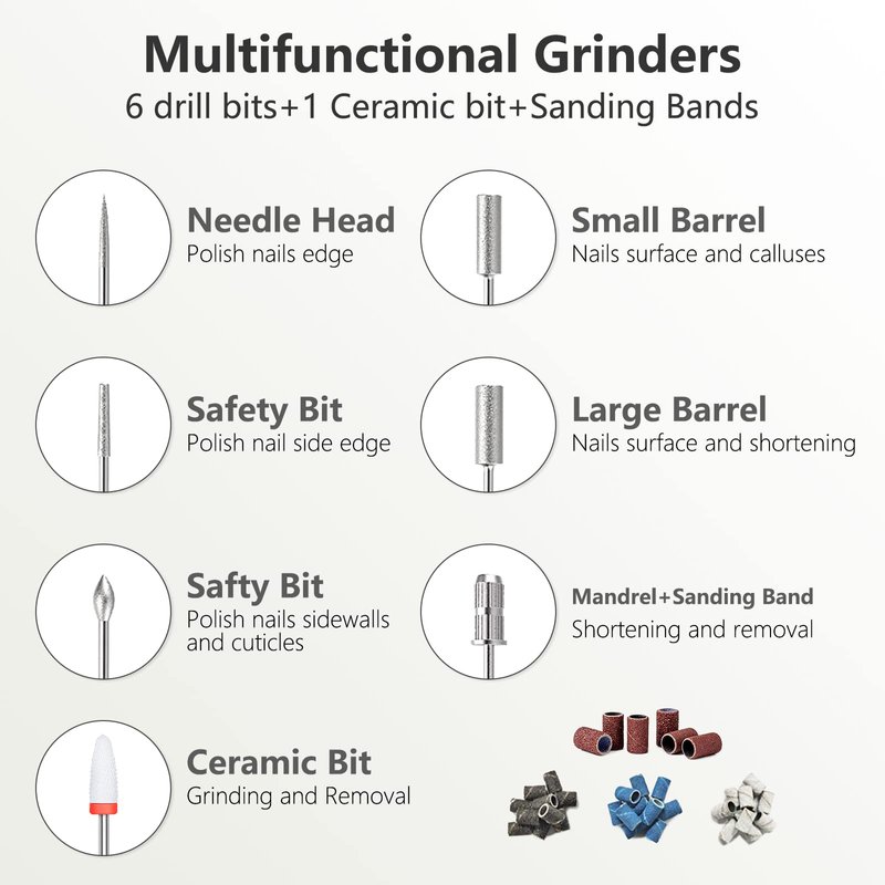 • Professional Electric Nail Drill Set:comes with 6 kinds of metal drill bits and 1ceramic bit,which can meet various manicure and pedicure needs: acrylic nails, gel nails, dip powder nails, cuticle and dead skin, calluses,thick nails