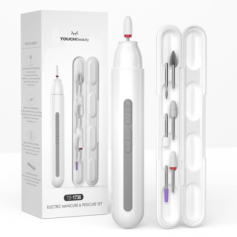 - PROFESSIONAL NAIL DRILL: TOUCHBeauty Electric Nail Drill Set is equipped with 6 high-quality nail care attachments made of SUS304 diamond sand, ceramic, chromium fused alumina, and natural wool. It effortlessly grinds, files, shapes, cuts, and polishes nails, smoothens calluses, thick nails, and removes acrylic nails, gel polish, dead skin, and more.