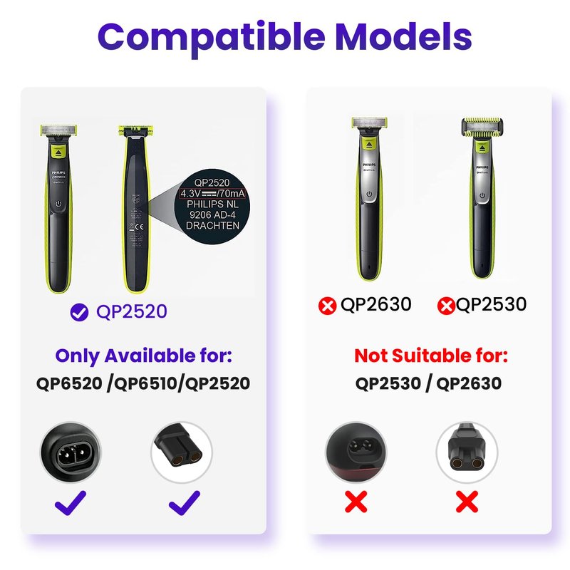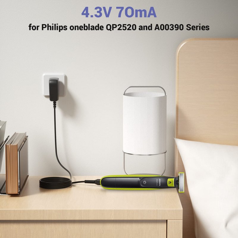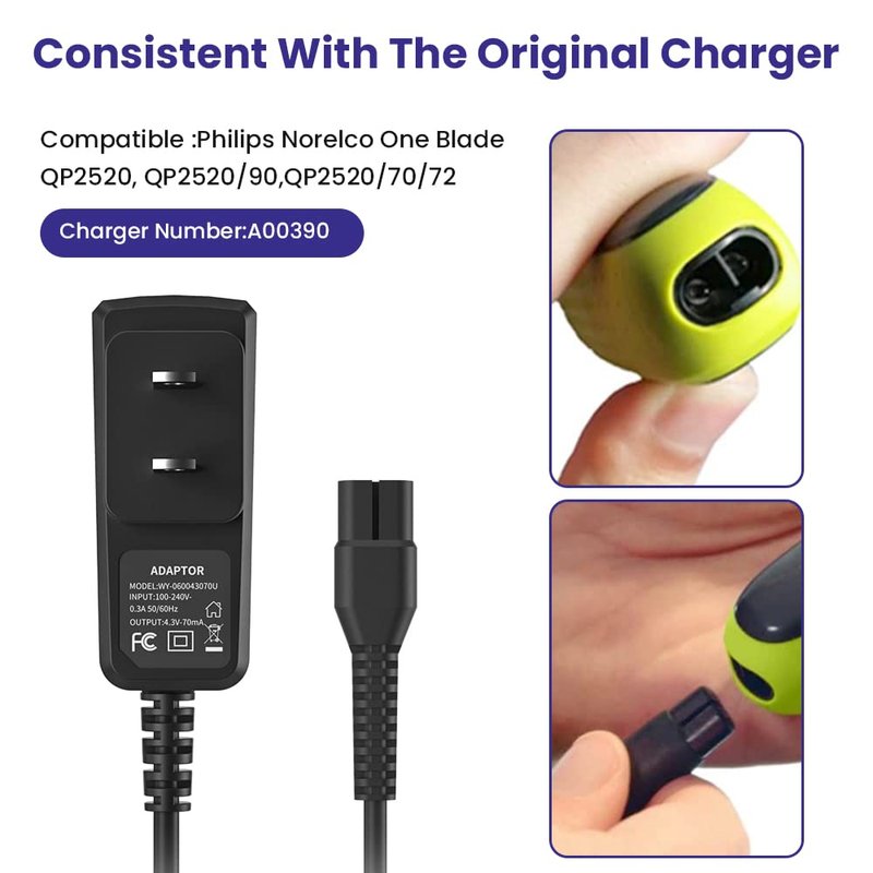Applicable models: 4.3V 70mA Charger power cord Fits for Philips Norelco OneBlade QP2520, QP2520/90, QP2520/72, QP2520/70 trimmer electric shavers. The 4.3V charging cable designed for Philips Norelco Oneblade shavers QP2520. 4.3V charger Replace the original A00390 charger.