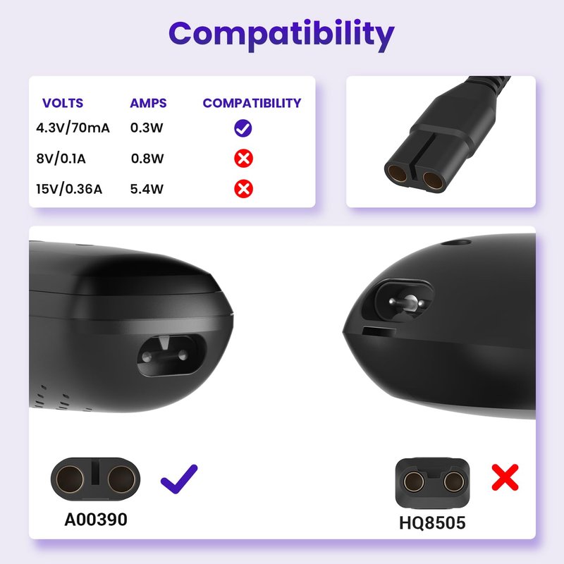 Kind tips:4.3V 70mA power adapter charging cable not applicable to Philips HQ8505(15V), HQ850(8V), 4.3V power cable not applicable to Philips Norelco One Blade QP2630, QP2530, QP2620, QP6505, QP6530 QP6550, QP6620, QP2630/70, QP6520(15V), QP6510(15V), QP2520 (4.3V). Please double check your shaver model and our charger plugs before purchasing.