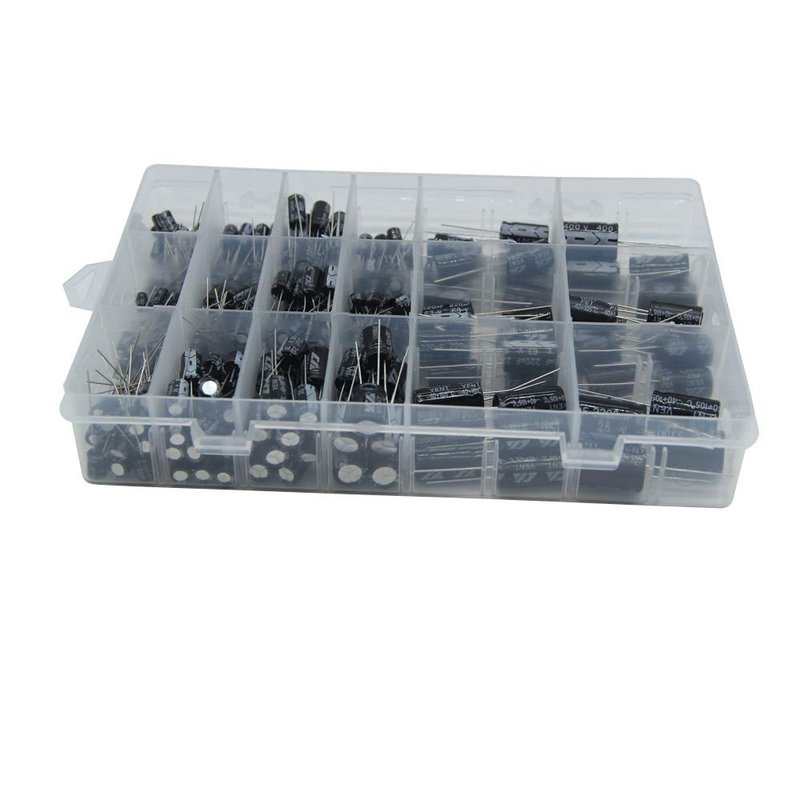 This electrolytic capacitor kit is used to cover the most common capacitance values of the most common capacitor types.