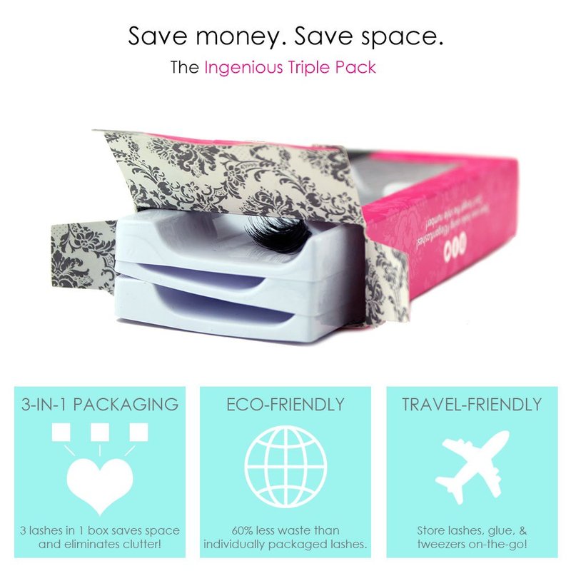 - 3 pairs of professional-quality decorated false eyelashes in one travel-friendly, reusable case!