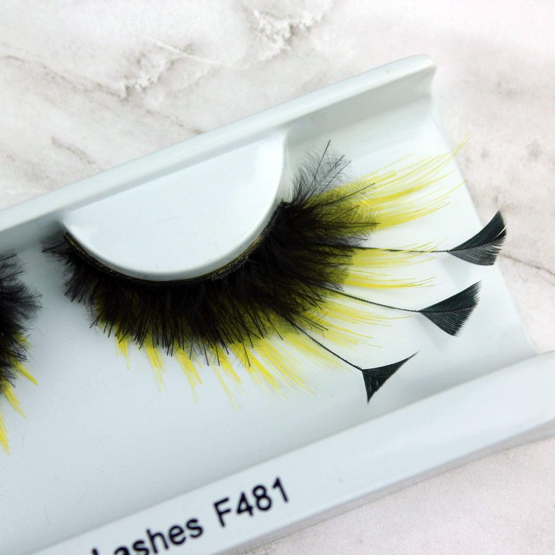 - Adorable yellow eyelashes with short, fuzzy black feathers and 3 black feather accent tips