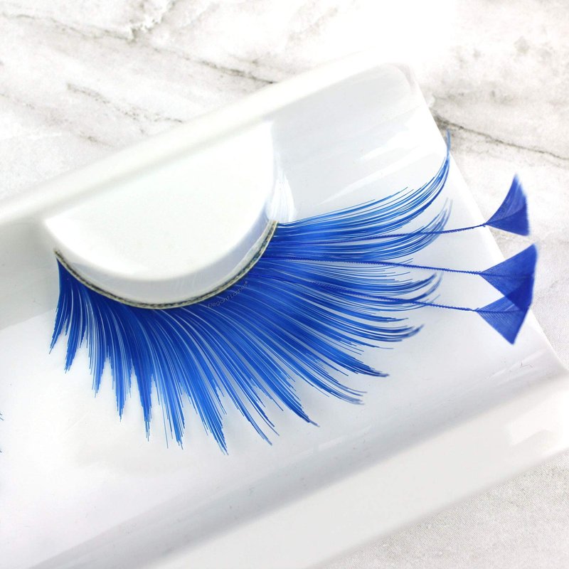 - Color: extra-large blue lashes with 3 long blue accent feathers. Use common sense! These are FEATHER lashes and are extremely delicate. DO NOT tug or pull feathers when removing from tray!