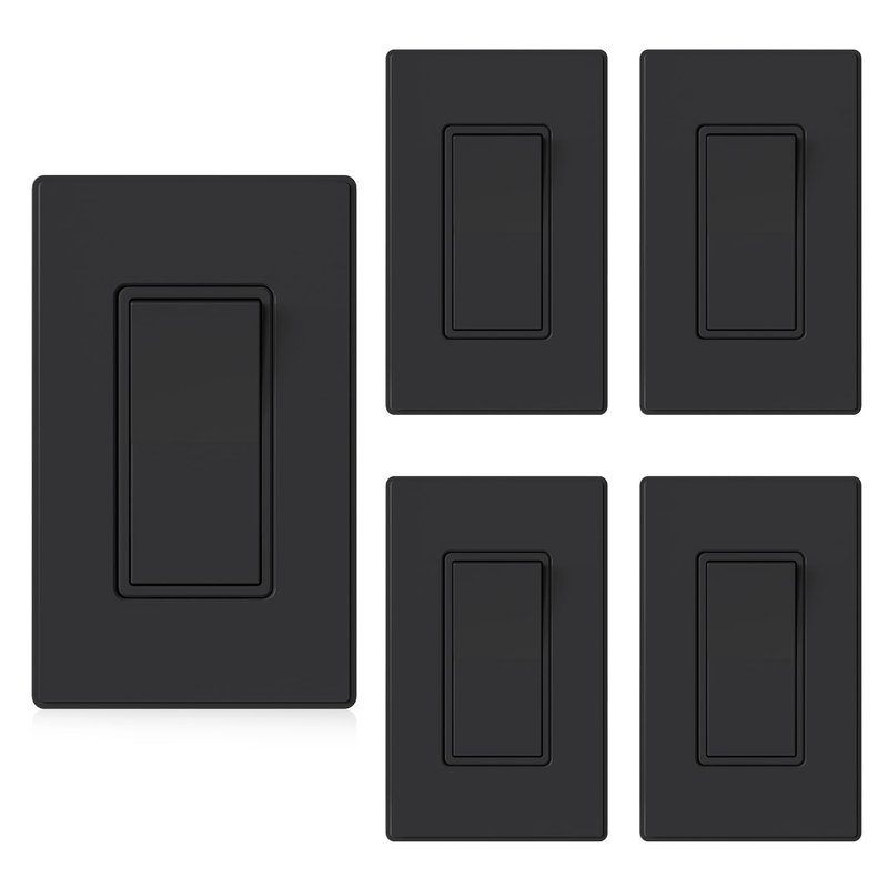 ELEGRP Matte Black Single Pole Decorator Light Switch, 15Amp 120/277V, Paddle Rocker Switch Wall Switch Replacement, Self-Grounding, Residential Grade, w/Wall Plate, UL/CUL (5 Pack)