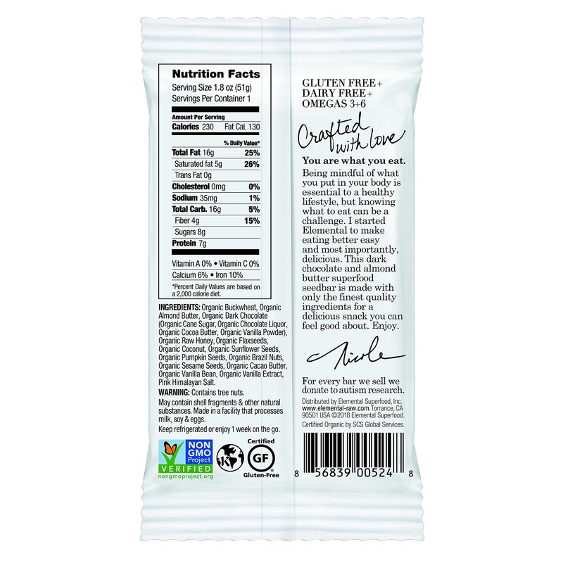 Gluten free + dairy free + omegas 3+6. Certified gluten-free. Non GMO Project verified. nongmoproject.org. Crafted with love. 12 superfood seedbars. You are what you eat. Being mindful of what you put in your body is essential to a healthy lifestyle, but knowing what to eat can be a challenge. I started Elemental to make eating better easy and most importantly, delicious. This dark chocolate and almond butter superfood seedbar is made with only the finest quality ingredients for a delicious snack you can feel good about. Enjoy. - Nicole. www.elemental-raw.com. For every bar we sell we donate to autism research.