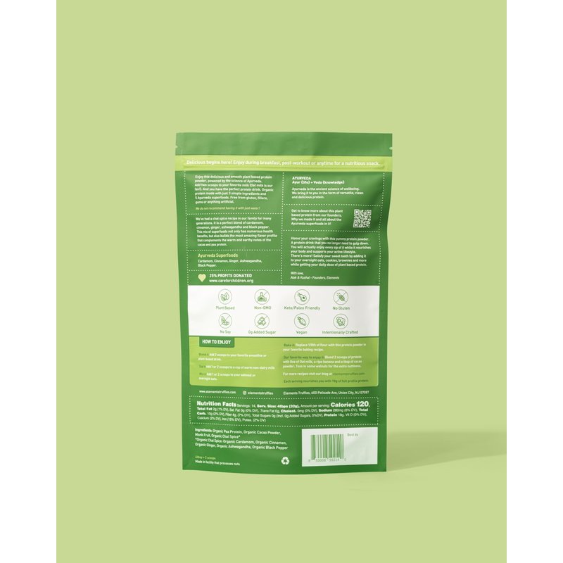 - AYURVEDA INSPIRED: All Elements Truffles products are based on Ayurveda style medicine. Ayur (life) plus Verda (knowledge) focuses on inner and outer wellbeing by creating balance. The traditional, warming chai blend in our protein supplement has benefits backed by science, while only containing natural ingredients.