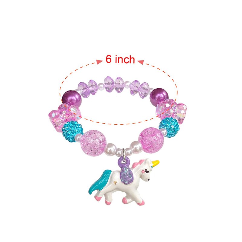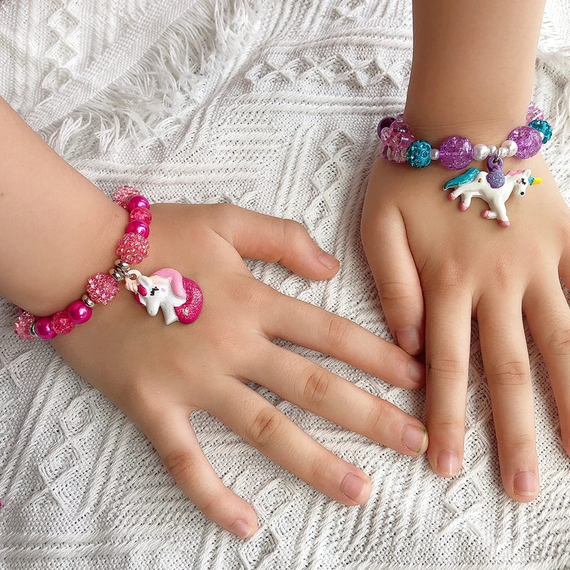 Package include: You will receive 5 pieces bead bracelets with different patterns, shown in picture.Breacelet size: Approx 6 inch circle for Bracelets, strong elastic, will fit both kids and adults.Bracelet Material: Made of quality crystal bead, lead and nickel free, easy to maintain. All the products have been tested and are safe for use.Adorable Design: Comes with Child-Friendly Designs and Colors. Unicorn Rainbow design, which is colorful and charm, and it will match your different outfit. Great Gift Choice: All bracelets are packed in one Pink Gift Box. Box size: 4.8"*3.2"*1.4" It's a good gift choose for baby girls, toddlers, kids, teens.
