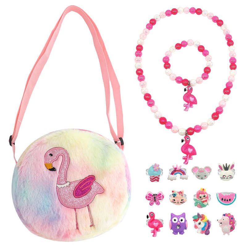 Elesa Miracle Little Girl Plush Purse Handbag Kids Necklace Pretend Play Toy Playset Jewelry Crossbody Purse for Children Toddler Baby Girls, Flamingo