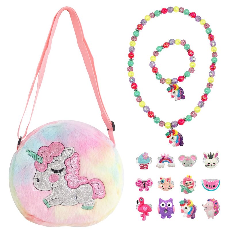 - Package include 1pc plush purse and toy playset jewelry set. Color is shown in picture.