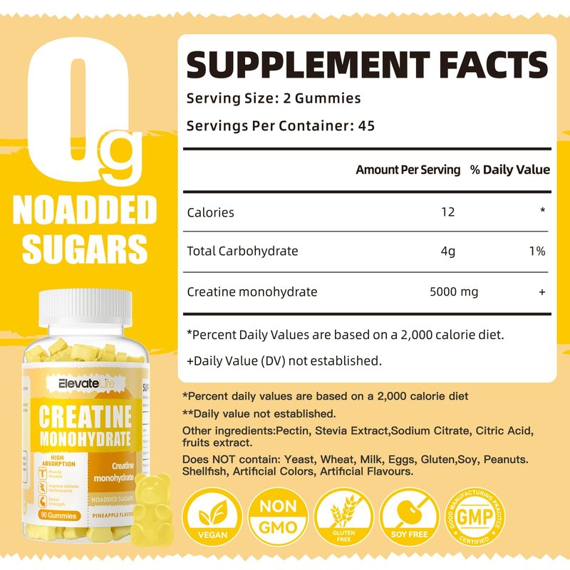 ElevateLife Creatine Monohydrate Gummies 5000mg for Men & Women, Chewables Creatine Monohydrate for Muscle Strength, Muscle Builder, Energy Boost, Pre-Workout Supplement-90 Pineapple Gummies