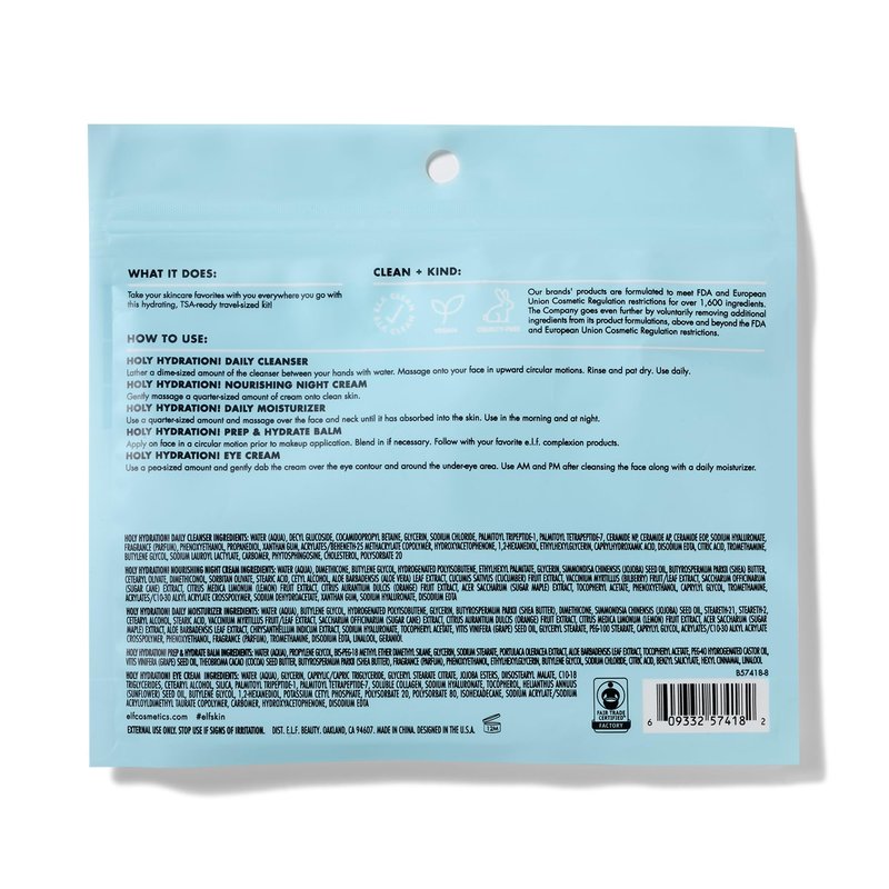 - SKINCARE ON THE GO: The e.l.f. Jet Set Hydration Kit contains all of your skincare favourites in a TSA-ready travel-sized kit. The kit includes a Cleanser (30ml), Hydrating Balm (6g), Moisturizer (25ml), Eye Cream (7g) and Night Cream (15g).