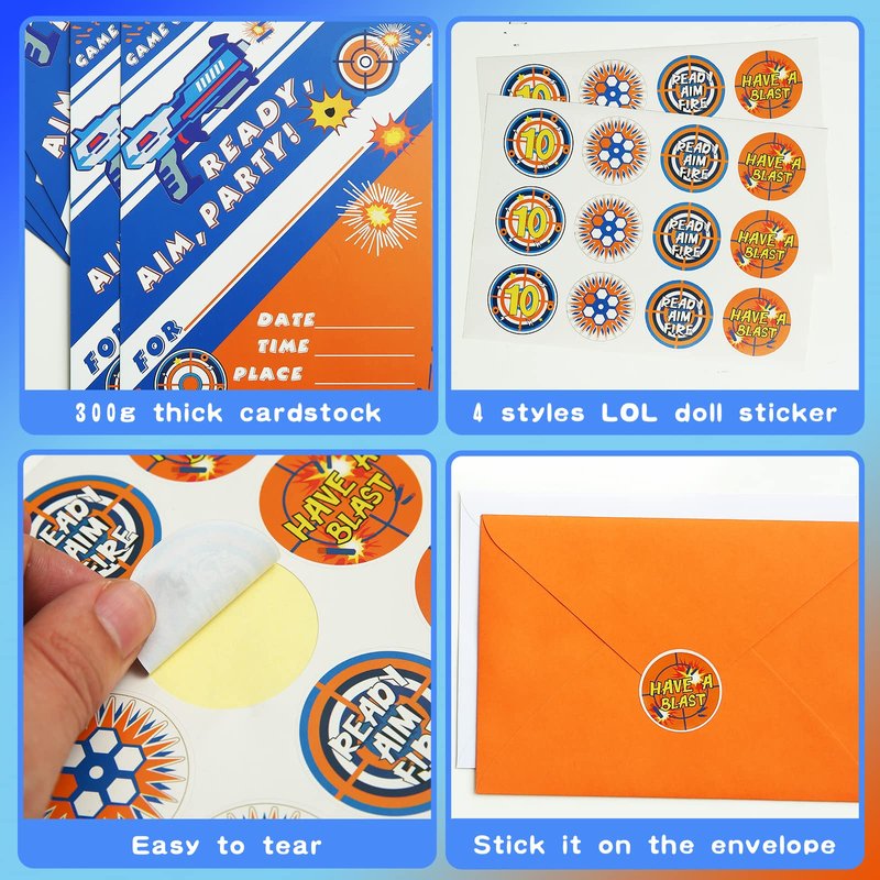 - DART WAR INVITATION SET:The invitation letter set contains 24 pieces nerf dart war gun party invitation cards, 12 pieces white envelopes, 12 pieces orange envelopes, and 24 pieces dart war stickers. Quantity is sufficient. You can send invitation cards to friends and family. Make your party more lively.