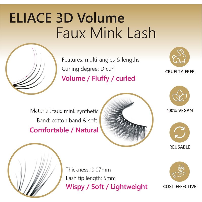 - [ Eliace Vegan lashes,Pretty lashes, light weight & strong, last long as well.] Eliace Faux Mink False Eyelashes 50 Pairs are Hypoallergenic, Sterilized and Cruelty-free.Easy to use / Easy to apply / Easy to remove.Even for beginners.Each pair of lashes can be reused up to more than 20 times.(No Glue)