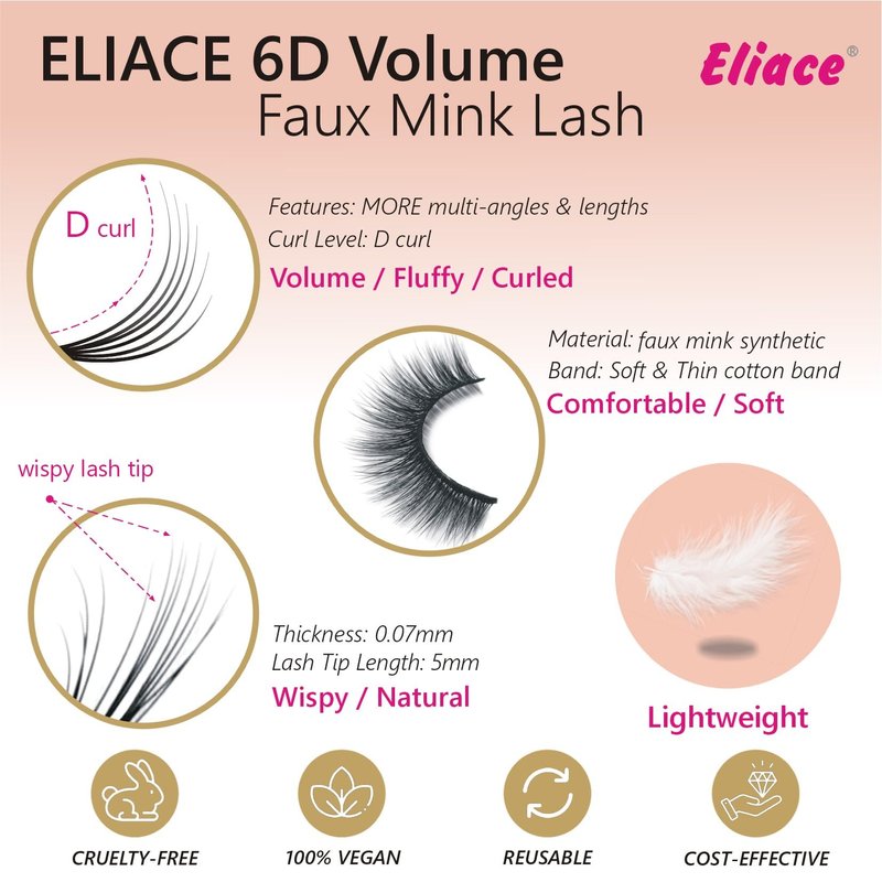 - ❷. 【 Lashes Soft And Comfortable 】: Eliace 30 Pairs Luxury 6D Fake Eyelashes, ( 100% CRUELTY-FREE , Easy to Apply ), flexible and easy to bend and skin friendly . The thickness of the false eyelashes is just 0.07mm , Each pair of eyelashes weighs just 0.004g - With THIN COTTON band and SOFT band, super lightweight and comfortable easy to wear and remove,even for beginners