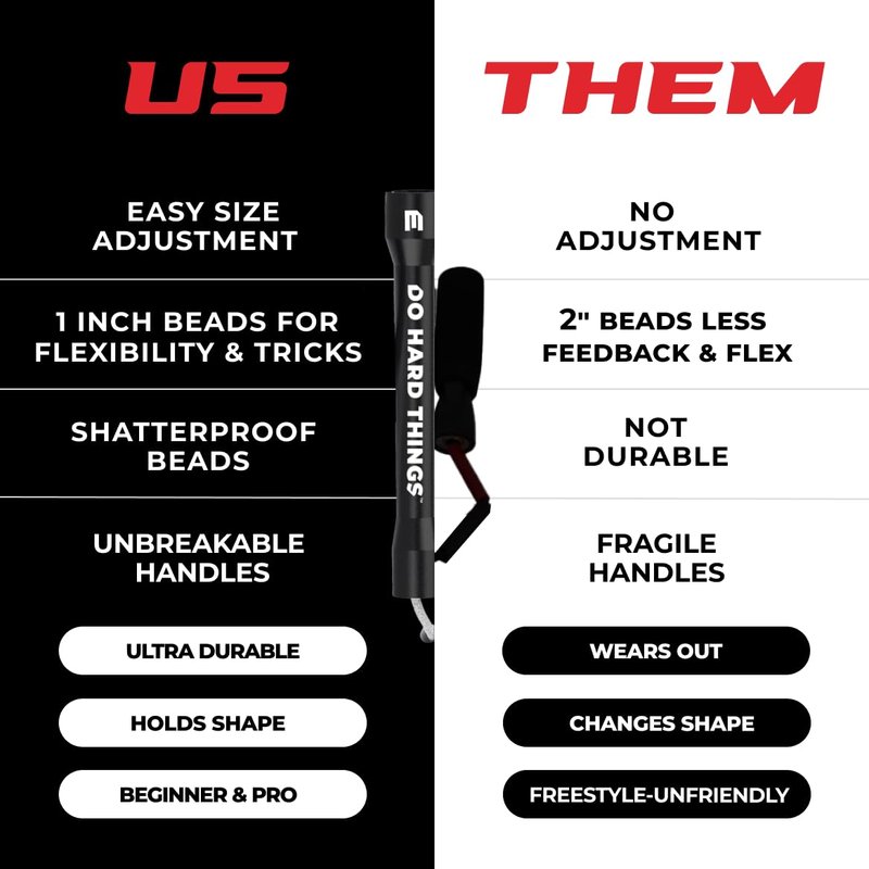- Quality Materials; We make high quality products for competitive jump rope athletes. This Do Hard Things skipping rope features our 5" unbreakable plastic polymer handles and 1" shatterproof plastic beads. This adjustable jump rope is a durable workout jump rope that can be used indoors/outdoors.