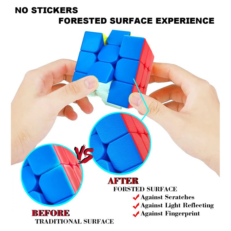 The speed cubes set includes 6 packs of 56mm speed cubes 3x3x3. Standard size and stickless surfaces are suitable for beginners and professional players. 56mm cube is easy to hold and play. 65g lightweight cube is good for a long hour of practice and playing.
