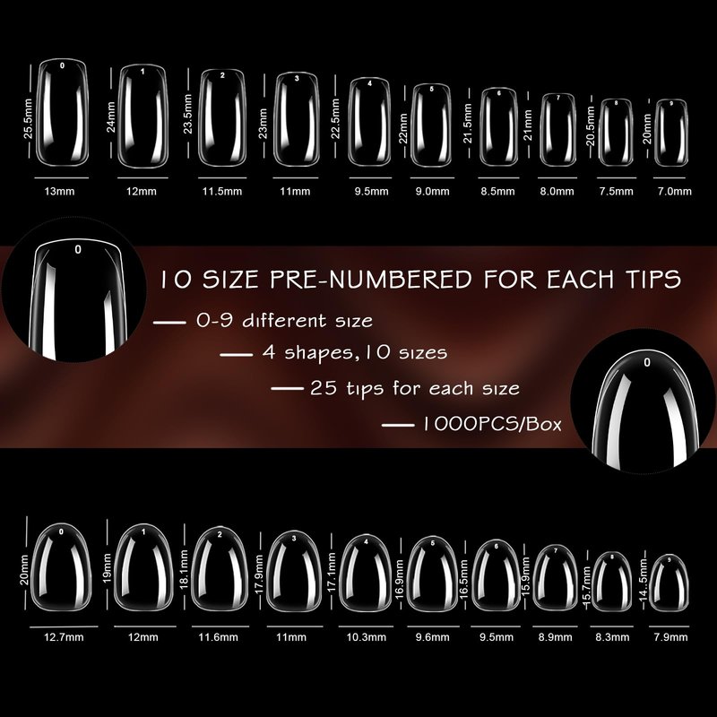 - 【1000Pcs & 4 Shapes Options】These fake nails are 4 shapes including almond, oval, square and coffin. Our clear nails contain 10 sizes, 25 tips for each size, a total of 1000 pieces. More nail tips and shapes than most products on the market and all for a fraction of the cost. Perfect for nail salon or nail party!