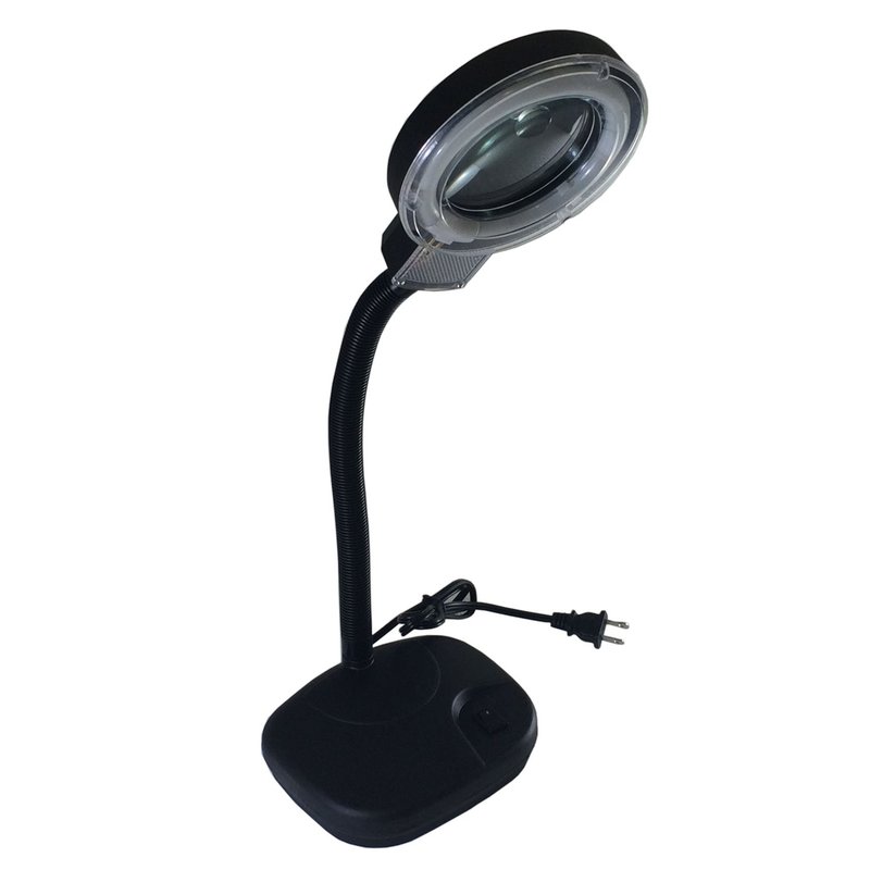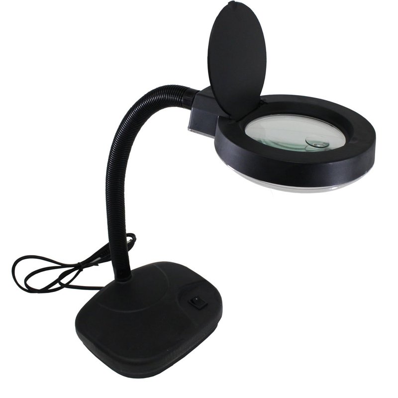 ELUCIDATE 2-in-1 5x Black Magnifier & Table Lamp (MG-99550), your versatile companion in crafting, reading, and executing precise tasks. Standing on a sturdy base with a sleek black finish, this essential tool embodies functionality and style.Constructed with a powerful 3½" (8.9 cm) diameter magnifier that hosts a 3 diopter/8 diopter lens, this innovative lamp ensures a distortion-free magnification, elevating your focus to the smallest details. Lift the flip-top cover to reveal the magnifier or keep it closed for a regular fluorescent desk lamp, illuminating your workspace with an 11W (11W) fluorescent light bulb. Its adaptable 12" (30.5 cm) flexible gooseneck directs a cool, steady stream of light exactly where needed, fostering optimal visibility at all angles.Operated with an easily accessible on/off switch located on the base, and powered by a 110V (110V) regular household current, the lamp is designed for seamless integration into your home or office environment. Adding to its array of features is a replaceable round fluorescent bulb, which guarantees longevity and consistent lighting.Whether you're a hobbyist needing a detailed view of intricate pieces, a student burning the midnight oil, or a professional aiming for precision in your craft, this lamp caters to a wide spectrum of users. The sleek design ensures it occupies minimal space on your table or countertop, making it a must-have for small and large workspaces alike.