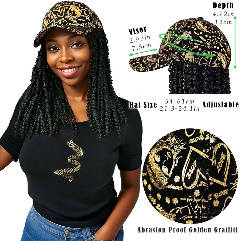 - Size: Featuring 12-inch passion twist hair extensions with a net weight of 285g, this breathable synthetic wig offers instant styling. The gold graffiti cap adds a trendy touch, while the extended adjustable strap ensures a comfortable fit for 95% of head sizes, preventing it from being too loose or too tight.