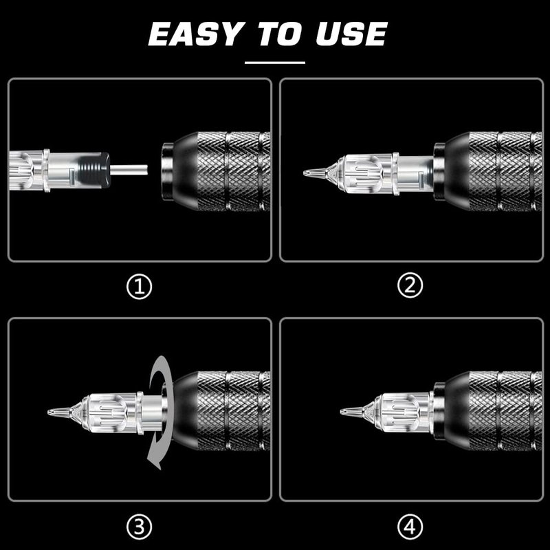 - High Stability - The tattoo needle cartridge is made of 316L stainless steel and plastic one piece needle. The indentation at tips enhance ink flow and saturation, it allows for maximum stability and control.
