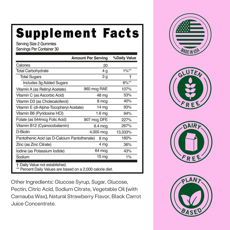 - SUPPORTS HEALTHY HAIR, SKIN, AND NAILS: These gummies are not only great for your skin but also help keep your hair and nails healthy and strong. They contain biotin (also known as Vitamin B7) which supports your body’s keratin structures, keeping your hair and nails strong and healthy.