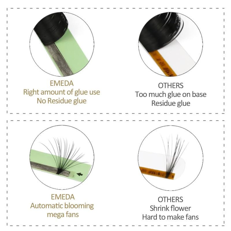 - BEST EASY FAN VOLUME LASHES:EMEDA Blooming Flower lashes is a one of a Special kind craft lash. The unique sticky lash strip will prevent the volume fans from separating at the base, that makes them automatically self fanning within seconds,easy to creat 2d-20d fans.