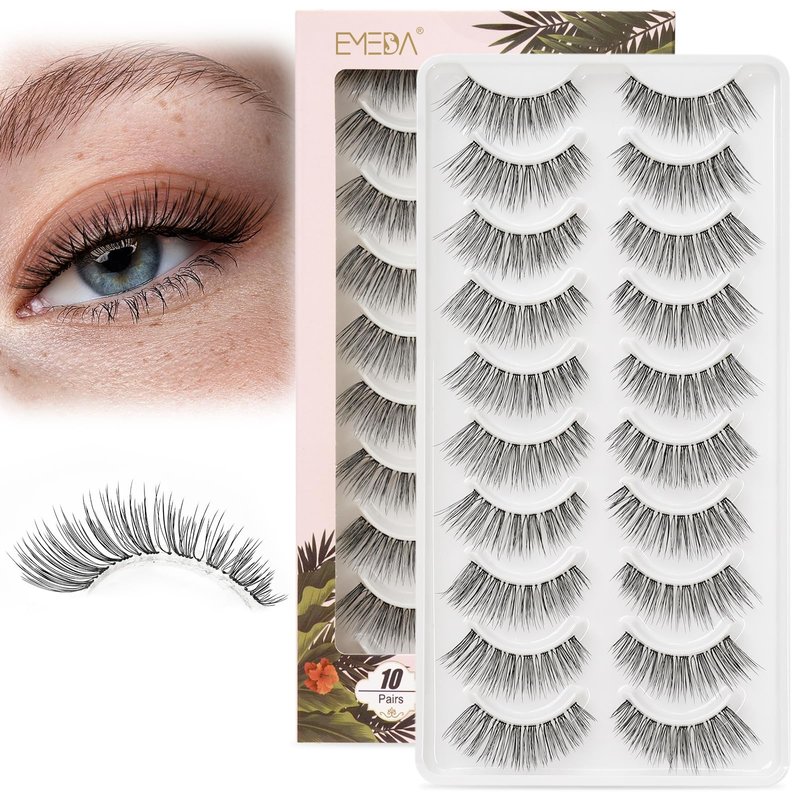 EMEDA False Eyelashes Natural Strips Look Pestañas Postizas Naturales 10 Pairs Invisible Band 3D Demi Wispies 12mm Fake Lashes Small Face Lashes Handmade Clear Band Eye Lashes(005)