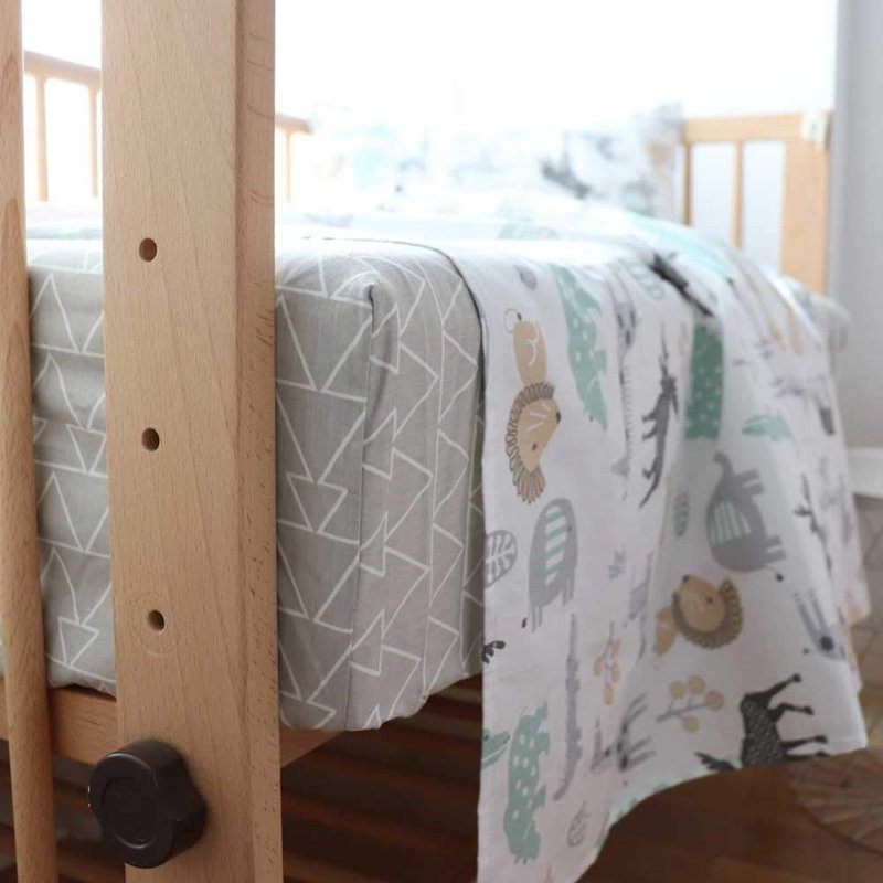 Material: 100% cotton Package Including :1 x Crib Fitted Sheet: 52” x 28” x 8” ; 1 x duvet cover : 39” x 47” ; 1 x Pillowcase: 11.5” x 19.5” (Not including the pillow and the quilt) WASHING & CARE INSTRUCTIONS 1. Machine wash with cold temperature, gentle cycle; 2. Tumble dry at low temperature; 3. Cool iron if needed; 4. Do not bleach. As parents, you must be very concerned about the safety and comfort of crib bedding’s fabric which comes close to baby skin. So are we.We choose to use 100% woven cotton which is soft ,breathable,skin-friendly and durable.And we also concern about the safty and the convenience when you use it .So we use the hidden zipper design and the inside corner bands .Besides, In order to relieve the separation anxiety between you and your baby ,we choose to use vivid patterns with soft shades of color on the bedding set .These will also provide perfect sensory stimulation for your baby.There are varieties of patterns for you to choose ,no matter for baby boys or for baby girls.