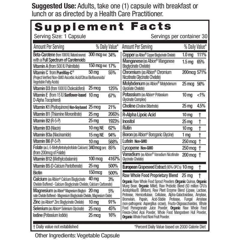 Take care of yourself and your health with Emerald Labs' Complete 1-Daily Multi, an all-in-one dietary supplement crafted with your body's daily nutritional requirements in mind.* This doctor-formulated multivitamin is designed to support your overall well-being with clinical amounts of essential nutrients and a whole-food blend that works in harmony with your body.*These vegetable capsules are formulated to support vision, energy, and focus.* Our unique blend includes a full spectrum of carotenoids, vitamins A, D, E, and K, as well as B complex and enzymes that are essential for supporting a healthy immune response and a healthy heart.*Coenzymated "activated" forms of B vitamins, including B2, B6, and methylated folate, support better bioavailability in just a single vegetable capsule serving.*Complete 1-Daily Multi is made with the gold standard of minerals and vitamins, including Albion Mineral Chelates, and PureWay-C Vitamin C with 12-hour sustained release.* The addition of sunflower-based D-alpha tocopherol, lutein, lycopene, alpha lipoic acid, and grape seed extract contributes to the array of benefits of this supplement.*We believe in quality without compromise. That's why our supplements are free from additives during the manufacturing process, gluten, and are vegetarian-friendly, ensuring they are accessible to those with dietary restrictions. Our whole-food blend of organic sprout powders, probiotics, plant enzymes, and superfoods also supports wellness.*Emerald Labs has been family-owned and operated since our beginnings in 2001. We are committed to providing your family with formulas using supportive nutrient forms, manufactured at our facility without the use of additives. Plus, all of our products are Doctor formulated. You can feel confident in supporting your health with Emerald Labs' nutritional supplements.